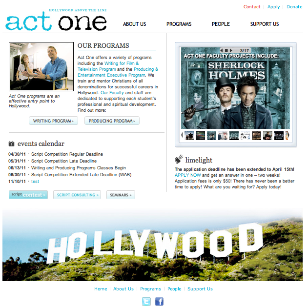 This is exactly what we discovered at Act One. We had AMAZING content—after all, we were founded as a screen writing organization—but no one was taking the time to read it. Web surfers hit our bewildering and, well, visually boring, front page and moved on.