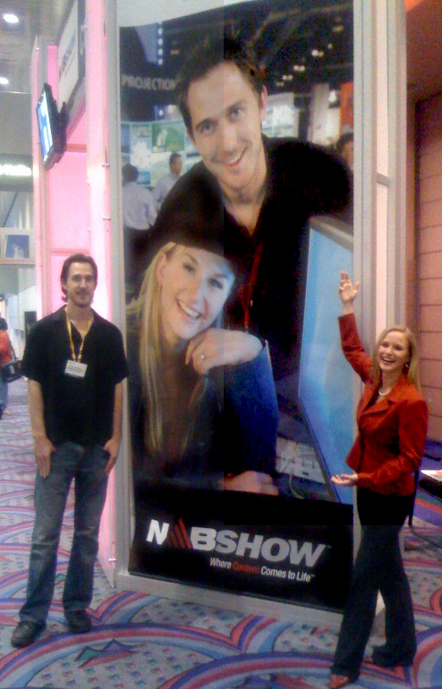 Jenn and Chris posing with a larger than life photo of, well, Jenn and Chris at the NAB show