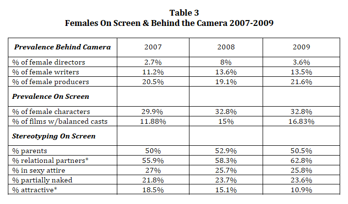 Less than 17 percent of films were gender-balanced, meaning they featured girls or women in 45 to 54.9 percent of speaking roles. Those findings were similar to the previous two years; only 15 percent were gender-balanced in 2008 and 12 percent in 2007.