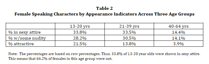 Perhaps most troubling were the findings about young teen characters. Professor Smith and her research team of undergraduate students found the same prevalence of sexually revealing clothing and partial nudity in female characters in all age groups from 13 to 39. In fact, 13- to 20-year-olds were just as likely as 21- to 29-year-olds to be depicted that way.